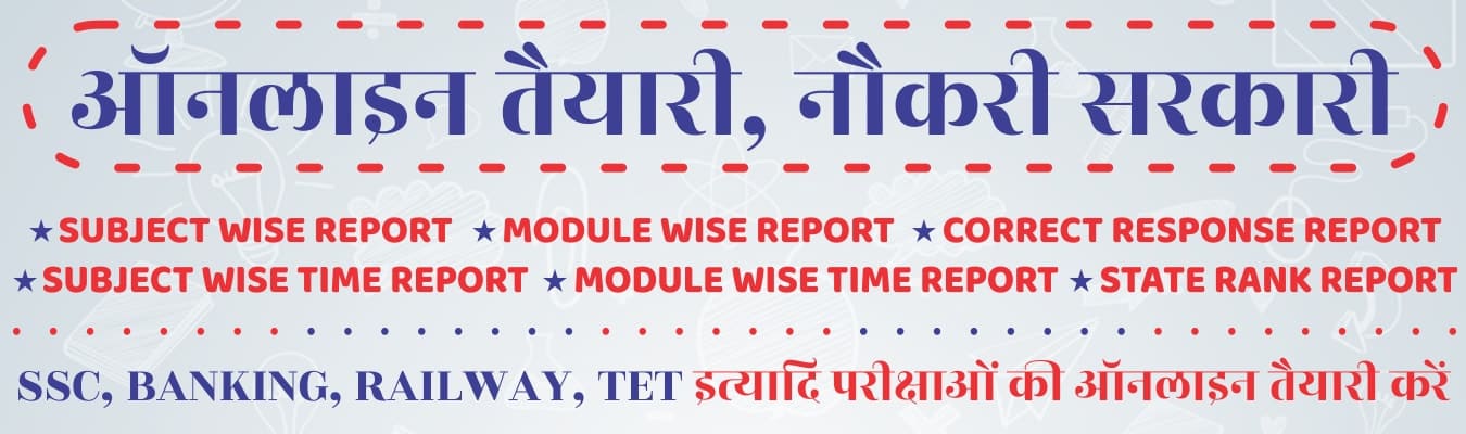सरकारी परीक्षाओं से सम्बंधित अनेक विवरण किसी भी अभ्यर्थी के लिए अति महत्वपूर्ण हैं | बहुधा सूचना के आभाव में मौके हाँथ से निकल जाते हैं | शुरू से ही सही वेबसाईट से जुड़कर अपने को अपडेट करते रहें | हमें आपकी चिंता है | हमारी वेबसाईट में बिभिन्न प्रकार की लगभग 60 सरकारी परीक्षाएँ सूचित हैं जिनमें SSC, TET, BANKING, RAILWAYS, POLICE, DEFENCE आदि सामिल हैं | हम ऑनलाइन द्वारा ट्यूटोरियल, प्रैक्टिस प्रश्नपत्र, और मॉक टेस्ट कराते हैं जिनकी रिपोर्ट्स विवरण सहित हिन्दी और अंग्रेजी में उपलब्ध करायी जाती है | इस प्रकार परीक्षार्थी अपने कंप्यूटर और मोबाइल फ़ोन द्वारा अपनी तैयारी का आकलन करके उसे यथा संभव सुधार सकते हैं |